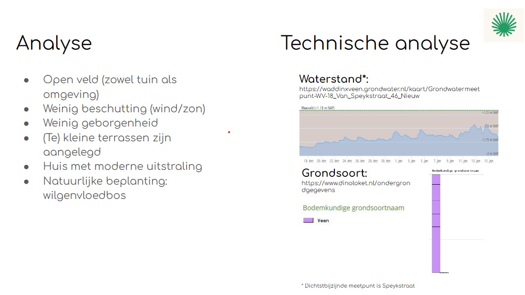 Van deze tuin met uitzicht over de polder had maar een deel een tuinbestemming. De rest moest gras blijven. De wensen van de bewoners waren om het uitzicht te behouden, een tuin met niet te veel onderhoud, maar waar wel in ieder jaargetijde iets te zien. De bewoners gingen voor een premium pakket omdat zij graag alles tot in detail uitgewerkt wilde hebben.
